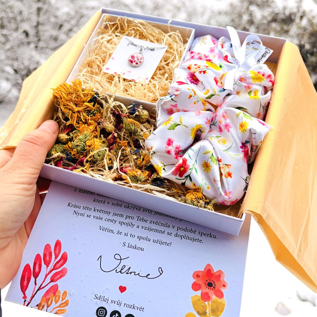Tento boxík v sobě ukrývá něžný náhrdelník s pravými květinami (rdesno, vřesovec, tařicovka) a romantickou saténovou gumičku s květinovým vzorem.