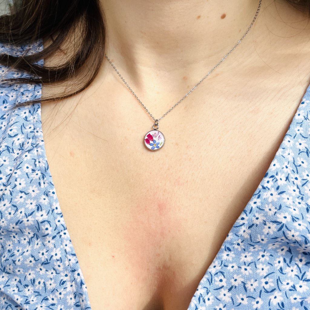 Náhrdelník Jarní zahrada, v kterém je ukryto skutečné kouzlo přírody, je vyroben z ručně sbíraných beskydských kvítků pomněnky, rdesna, vřesovce, lístku rozrazilu a křišťálové pryskyřice. Kov je kvalitní chirurgická ocel. Každý šperk je naprosto jedinečným dílem.