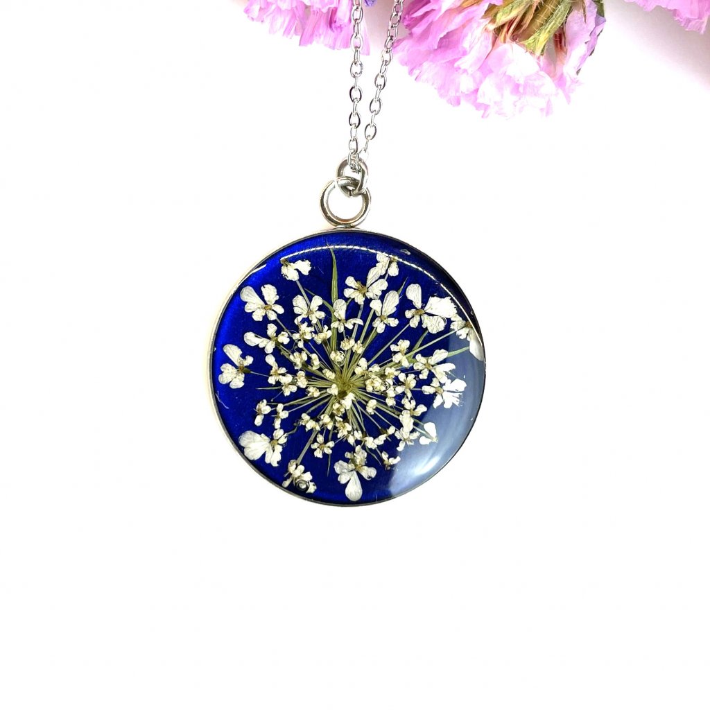 Náhrdelník, který v sobě ukrývá kouzlo květinové noci, je vyroben z květu mrkve obecné a z křišťálové pryskyřice. Kov je kvalitní chirurgická ocel. Každý šperk je naprosto jedinečným dílem.