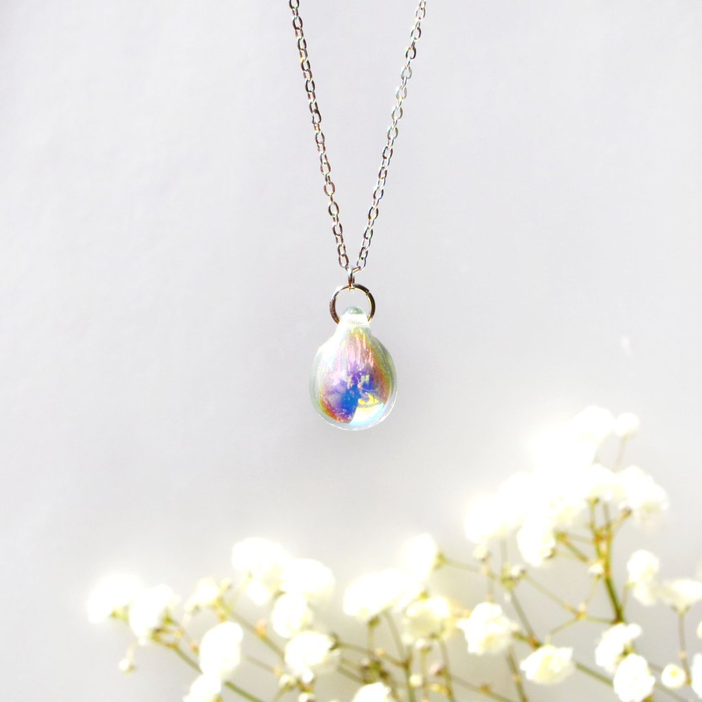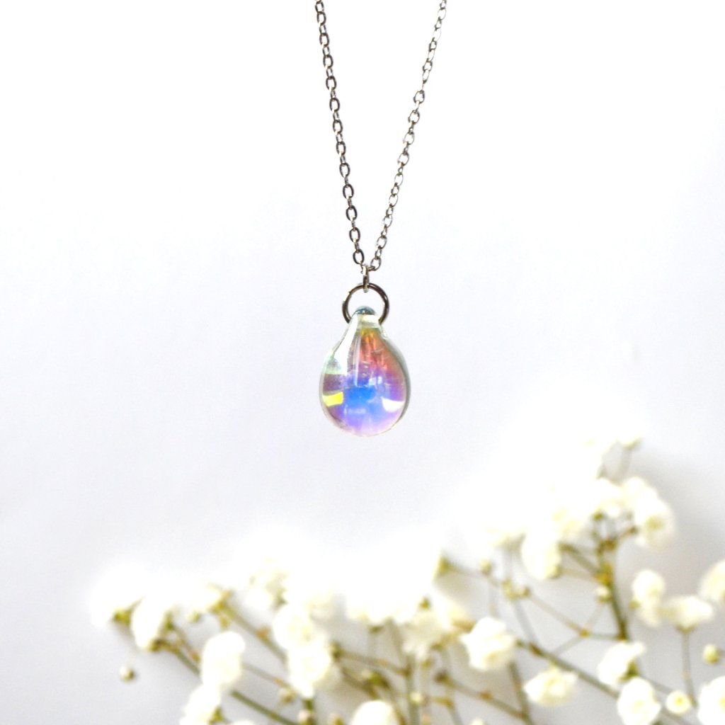 Kapka má světle zelený odstín a je průzračná s duhovými a perleťovými odlesky.