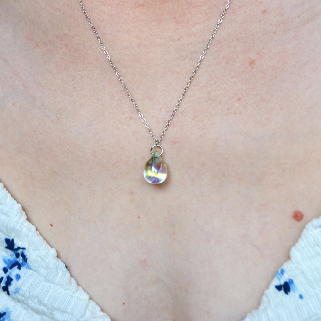 Světle zelený náhrdelník Kouzlo duhy, který se při dopadu světla rozzáří barevnými odlesky. Působí něžně a přitom magicky, jako by v sobě ukrýval kousek přírodní harmonie. Tento skleněný šperk podtrhne Vaši osobitost a přirozenost. Náhrdelník je jako jemný dotek přírody, který v sobě nese naději a proměnu v každém odlesku světla.