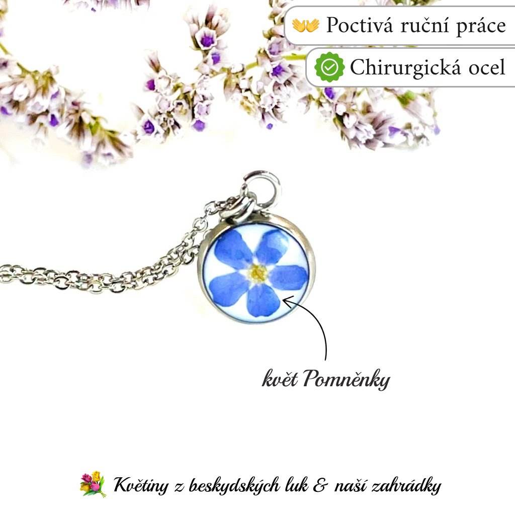 Malinký náhrdelník s drobným kvítkem pomněnky je vyroben z pravého květu a z křišťálové pryskyřice. Komponenty jsou z chirurgické oceli.