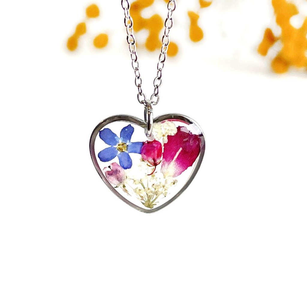 Náhrdelník Láska z Beskyd je vyroben z okvětního lístku růže, kvítku pomněnky, vřesovce, mrkve a křišťálové pryskyřice. Kov je kvalitní chirurgická ocel. Každý šperk je naprosto jedinečným dílem.