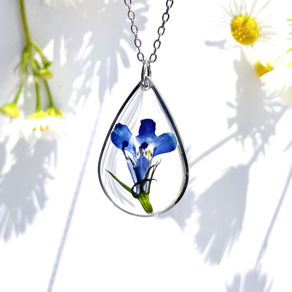 Náhrdelník Lobelka, v kterém je ukryto skutečné kouzlo přírody, je vyroben z ručně sbíraných beskydských kvítků lobelky a křišťálové pryskyřice. Kov je kvalitní chirurgická ocel. Každý šperk je naprosto jedinečným dílem.
