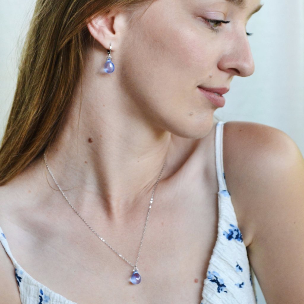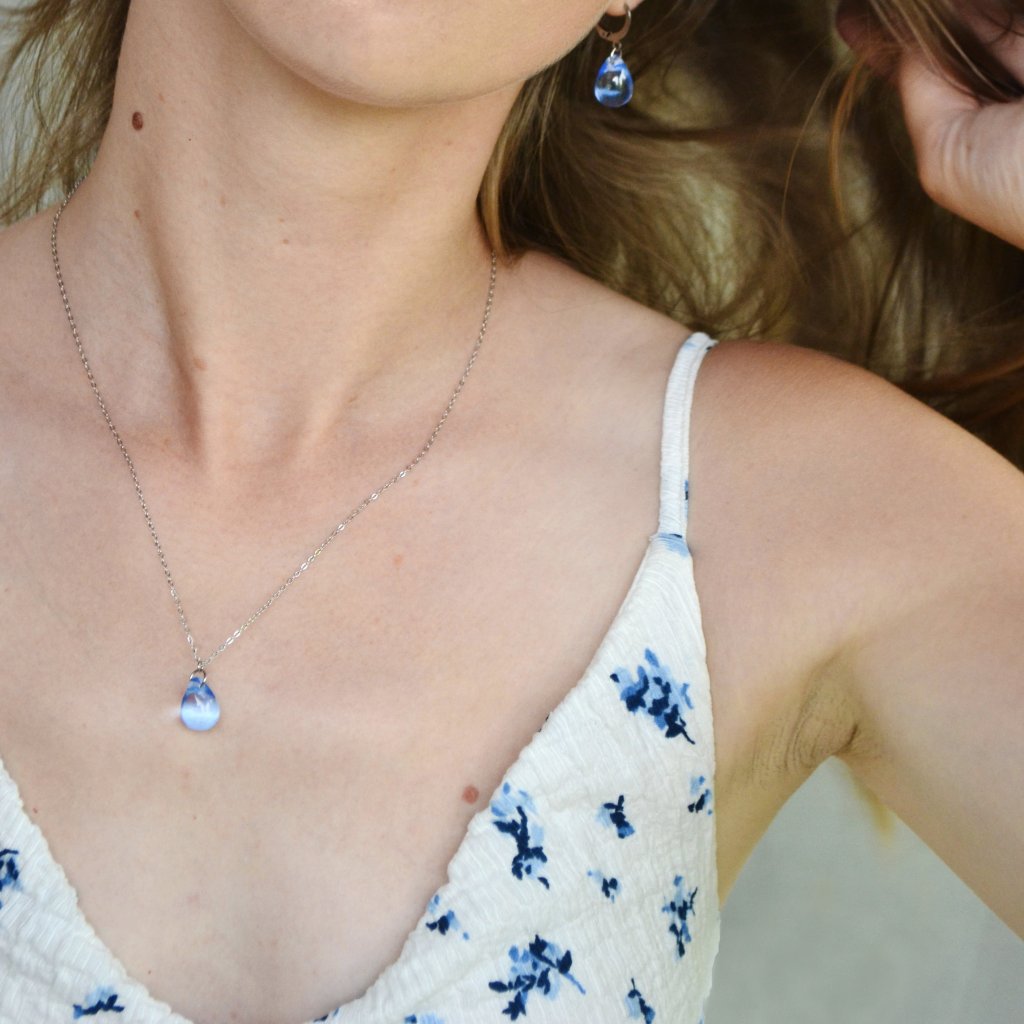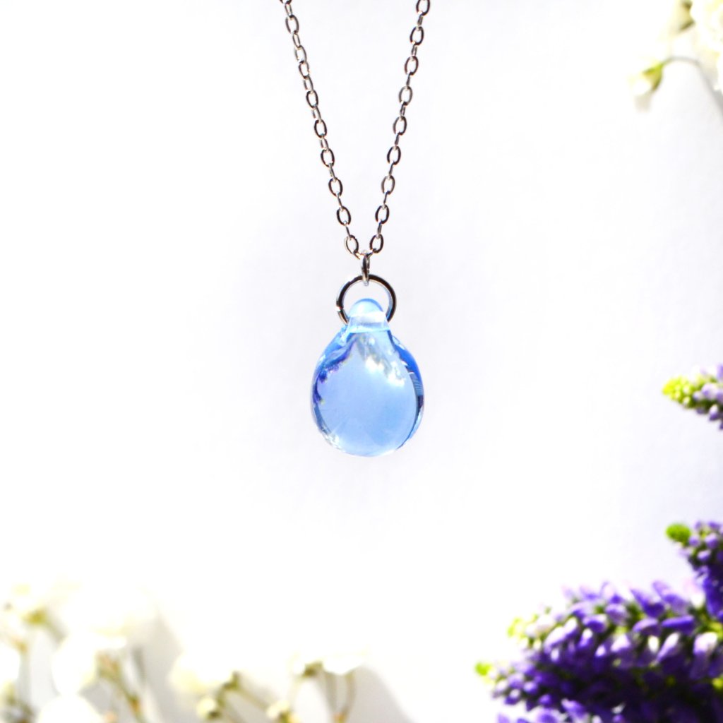 Jemně modrý odstín a tvar kapky vás přenesou do světa přírodní krásy a řemeslného umění. Každý kousek je jedinečný, vytvořený s láskou a péčí. Náhrdelník je vyroben z českého skla a chirurgické oceli.