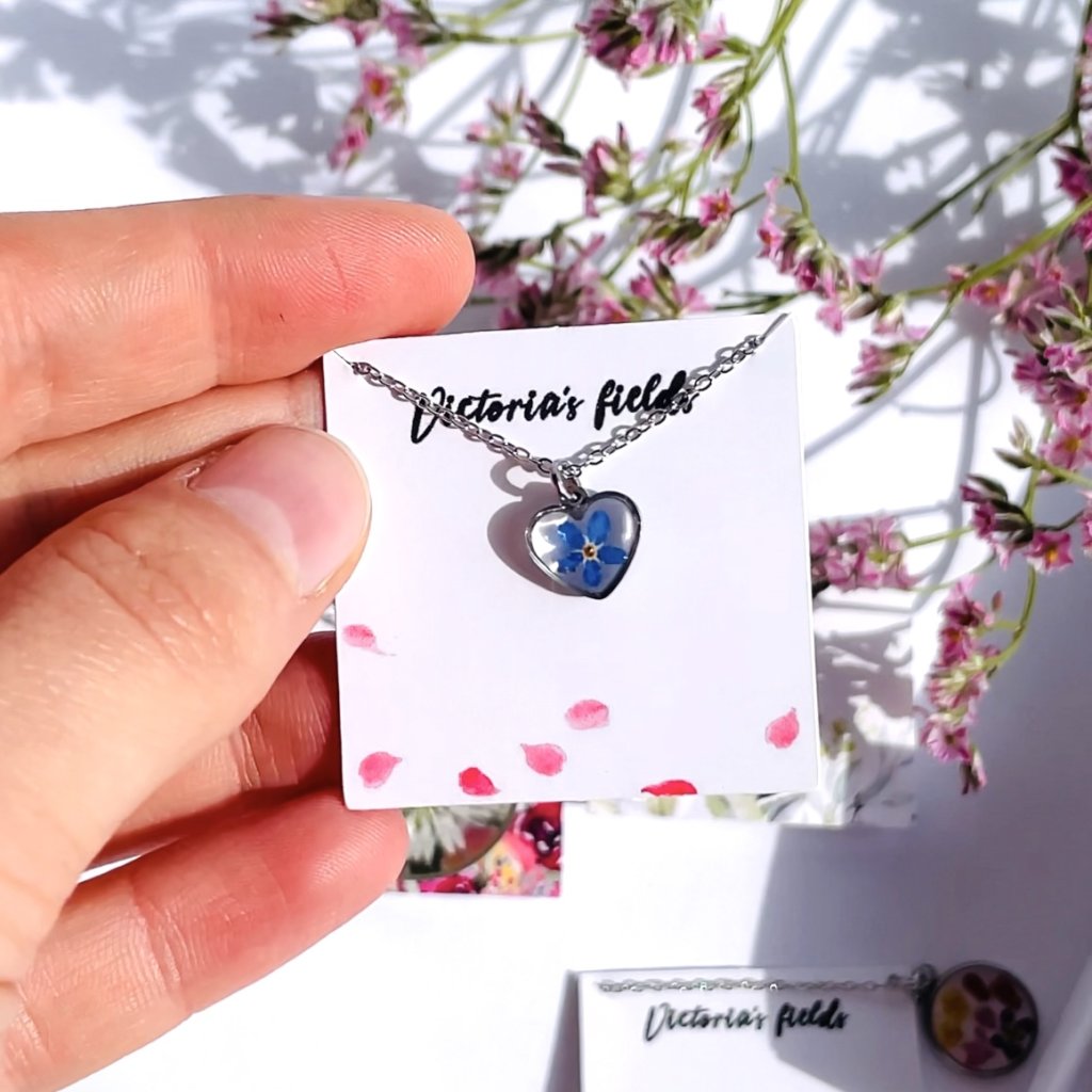 Náhrdelník Něžná láska, v kterém je ukryto skutečné kouzlo přírody, je vyroben z ručně sbíraného květu pomněnky a křišťálové pryskyřice. Kov je kvalitní chirurgická ocel. Každý kousek je naprosto jedinečným dílem.