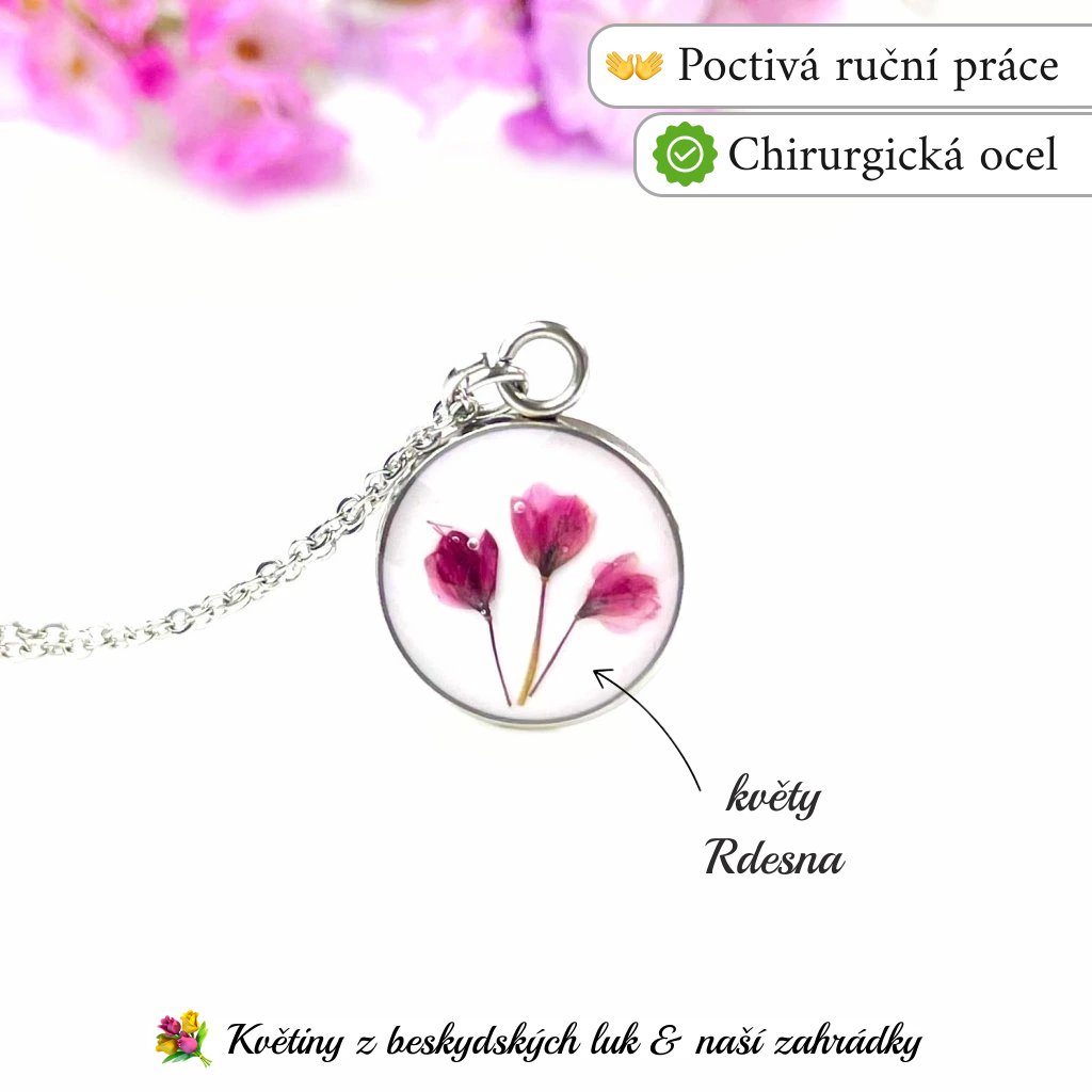 Šperk je vyroben z kvítků rdesna a z křišťálové pryskyřice. Kov je kvalitní chirurgická ocel. Každý kousek je naprosto jedinečným dílem.
