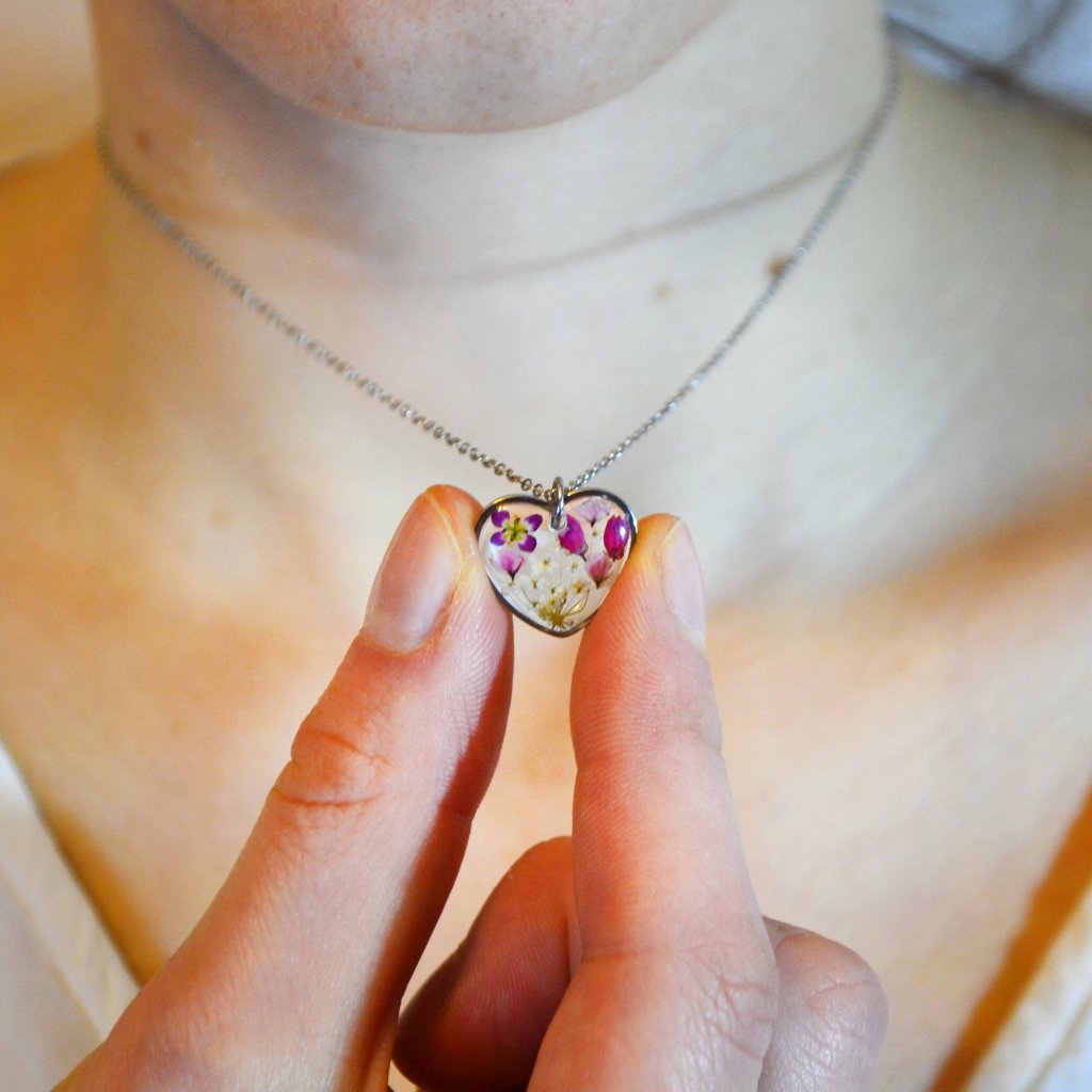 Náhrdelník Voňavá láska, v kterém je ukryto skutečné kouzlo přírody, je vyroben z ručně sbíraných beskydských kvítků rdesna, mrkve, vřesovce, tařicovky a křišťálové pryskyřice. Kov je kvalitní chirurgická ocel. Každý šperk je naprosto jedinečným dílem.