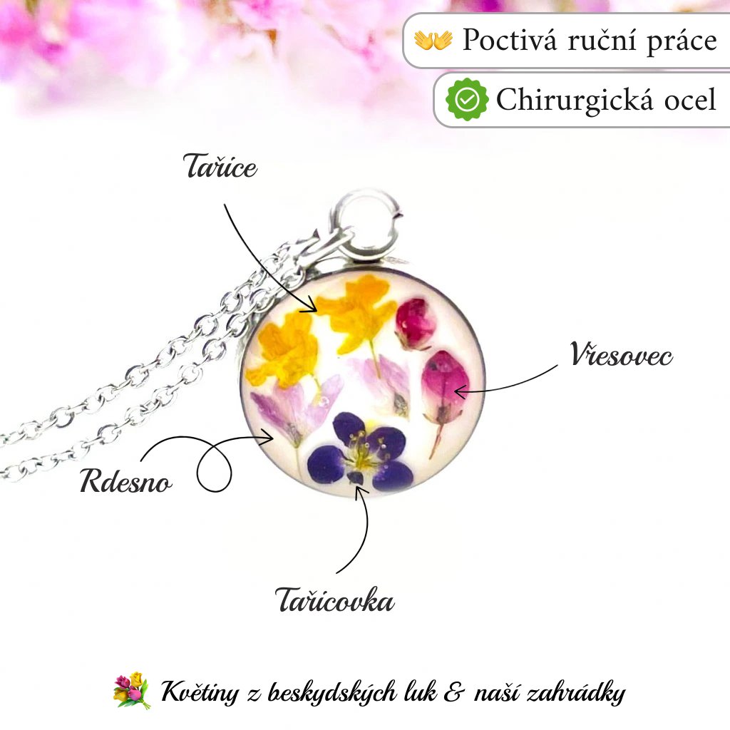 Náhrdelník je vyroben z kvítků rdesna, vřesovce, tařice, tařicovky a křišťálové pryskyřice. Kov je kvalitní chirurgická ocel. Každý šperk je naprosto jedinečným dílem.