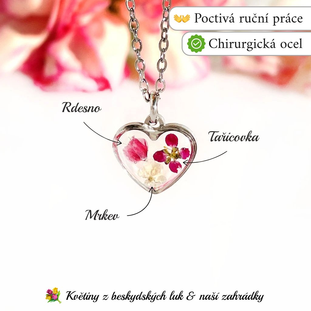 Náhrdelník Z lásky, v kterém je ukryto skutečné kouzlo přírody, je vyroben z ručně sbíraného květu tařicovky, mrkve, rdesna a křišťálové pryskyřice. Kov je kvalitní chirurgická ocel. Každý kousek je naprosto jedinečným dílem.