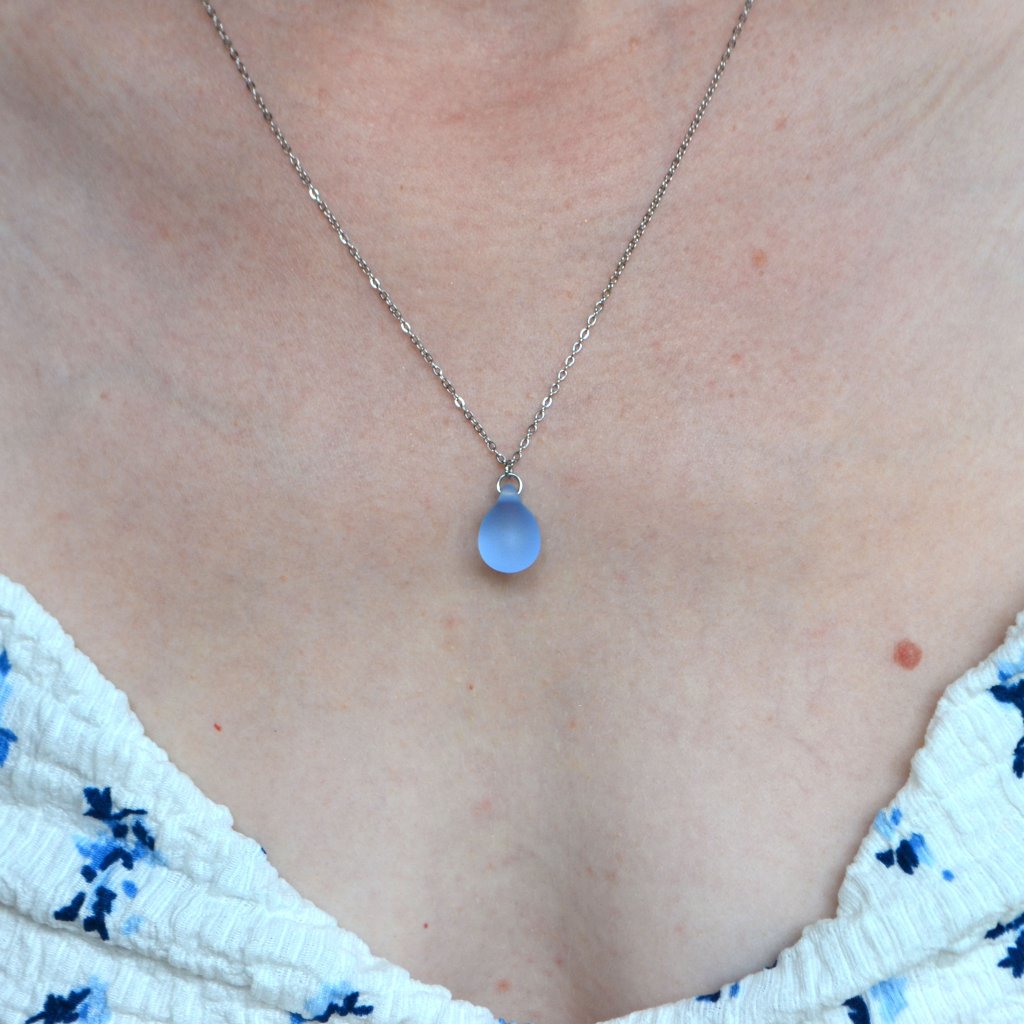 Nechte se okouzlit tímto ručně vyrobeným náhrdelníkem z českého skla a chirurgické oceli. Světle modrý odstín a tvar kapky vás přenesou do světa přírodní krásy a řemeslného umění. Každý kousek je jedinečný, vytvořený s láskou a péčí.