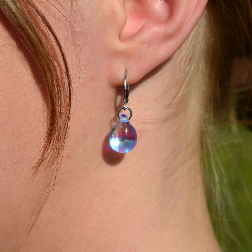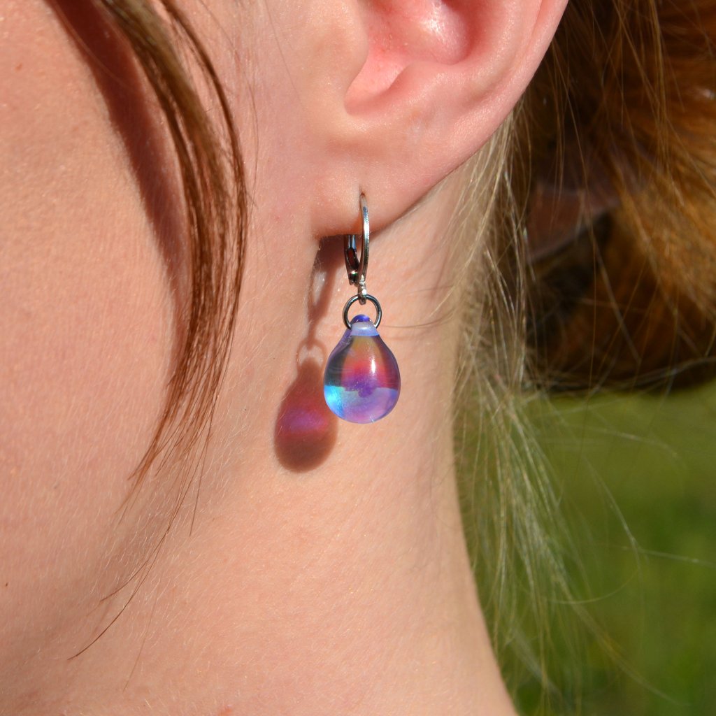 Jemně fialové náušnice Kapky štěstí jsou jako malý vesmír zachycený v jemném skle, nesoucí tajemství života a přírodní harmonie. Přivolávají radost a štěstí do každodenního života. Okouzlí Vás duhovými odlesky, které zachytí a rozptýlí světlo jako jemný magický tanec. Budou Vašim amuletem, který Vám bude připomínat, že štěstí je všude kolem nás, přítomno i v těch nejjemnějších detailech, stačí jej jen vnímat a nechat proniknout do svého života.
