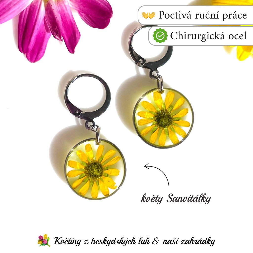 Náušnice Květ sanvitálky, v kterých je ukryto skutečné kouzlo přírody, jsou vyrobeny z ručně sbíraných květů sanvitálie a křišťálové pryskyřice. Kov je kvalitní chirurgická ocel. Každý kousek je naprosto jedinečným dílem.