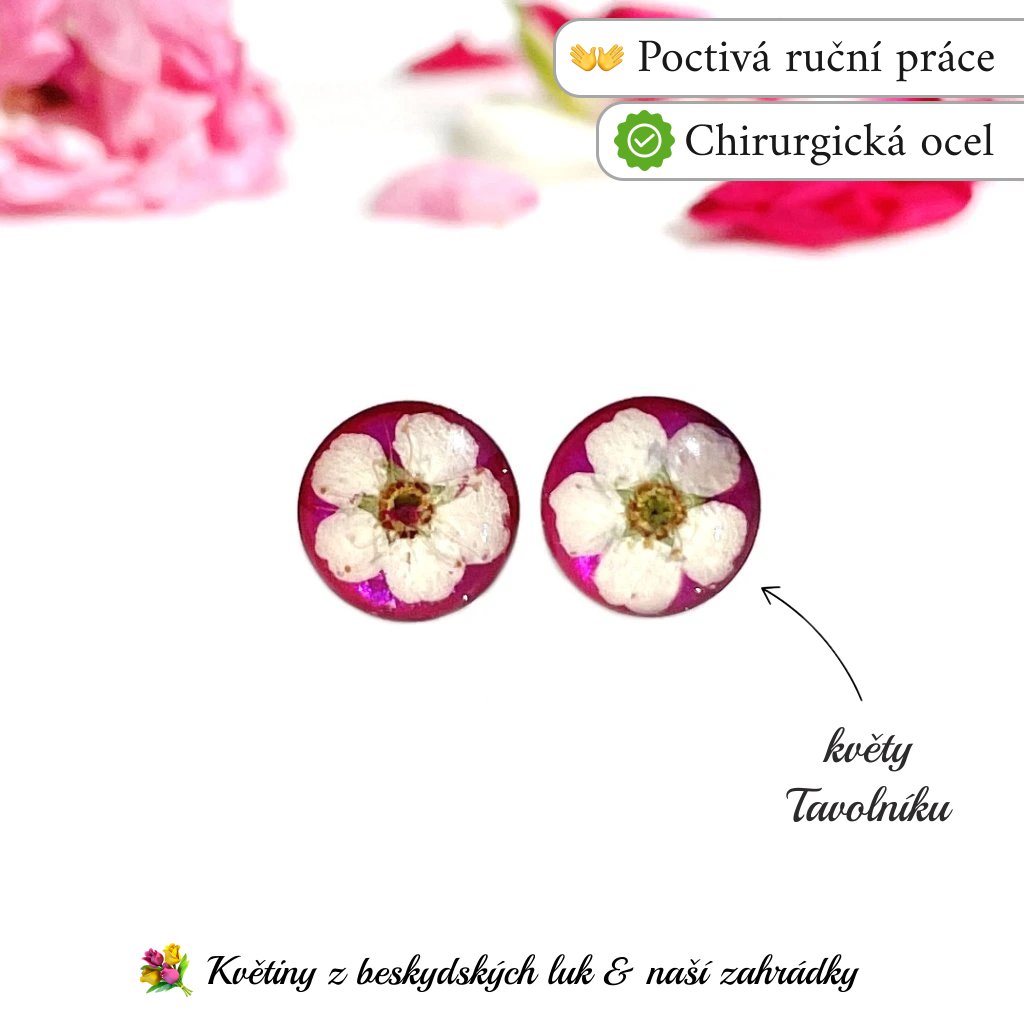 Náušnice Kvíteček, v kterých je ukryto skutečné kouzlo přírody, jsou vyrobeny z opravdových kvítků tavolníku a křišťálové pryskyřice. Kov je kvalitní chirurgická ocel. Každý kousek je naprosto jedinečným dílem.