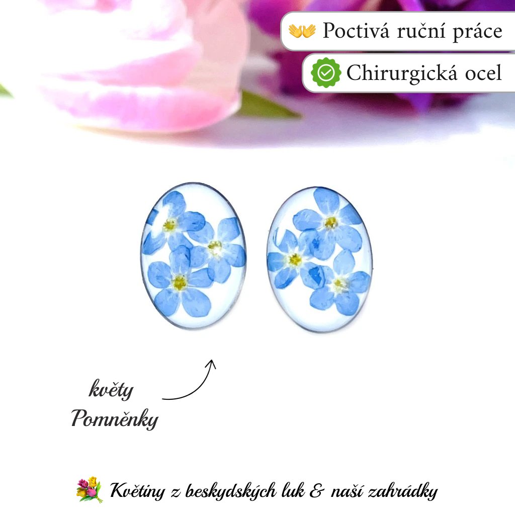Náušnice, s kvítky modrých jarních pomněnek, jsou vyrobeny z křišťálové pryskyřice a z ručně sbíraných a sušených květin. Komponenty jsou z chirurgické oceli.