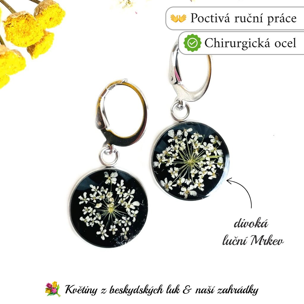 Náušnice Půlnoční obloha jsou vyrobeny z kvítků mrkve a křišťálové pryskyřice. Kov je kvalitní chirurgická ocel. Každý šperk je naprosto jedinečným dílem.