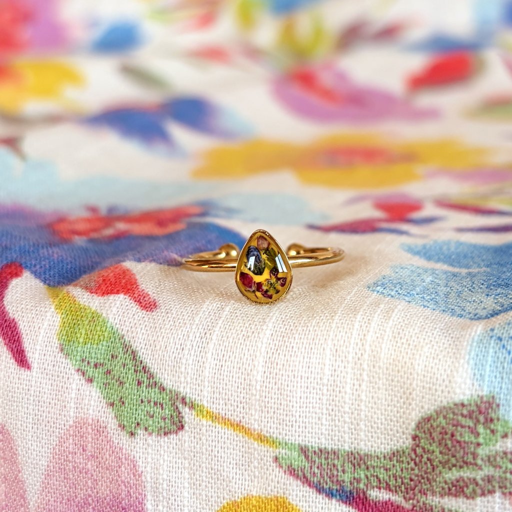 Prsten, v kterém je ukryto kouzlo beskydských luk. Šperk je vyroben z opravdového květu a z křišťálové pryskyřice. Kov je pozlacená chirurgická ocel. Každý šperk je naprosto jedinečným dílem.