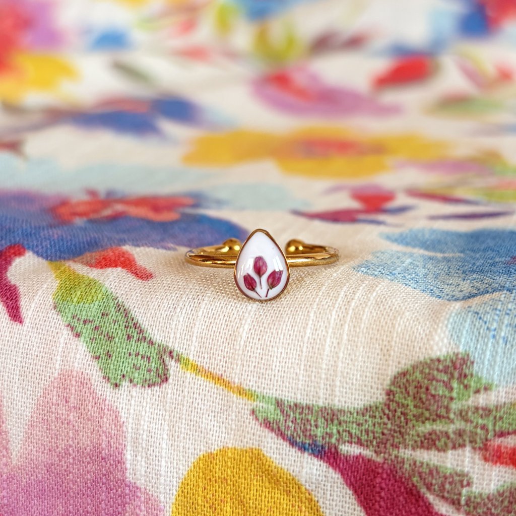 Prsten, v kterém je ukryto kouzlo beskydských luk. Šperk je vyroben z opravdového květu a z křišťálové pryskyřice. Kov je pozlacená chirurgická ocel. Každý šperk je naprosto jedinečným dílem.