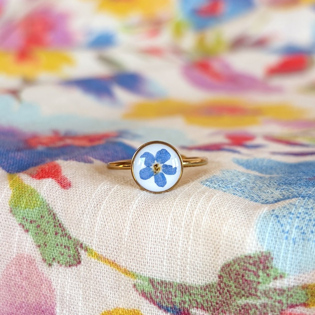 Prsten, v kterém je ukryto kouzlo beskydských luk. Šperk je vyroben z opravdového květu a z křišťálové pryskyřice. Kov je pozlacená chirurgická ocel. Každý šperk je naprosto jedinečným dílem.