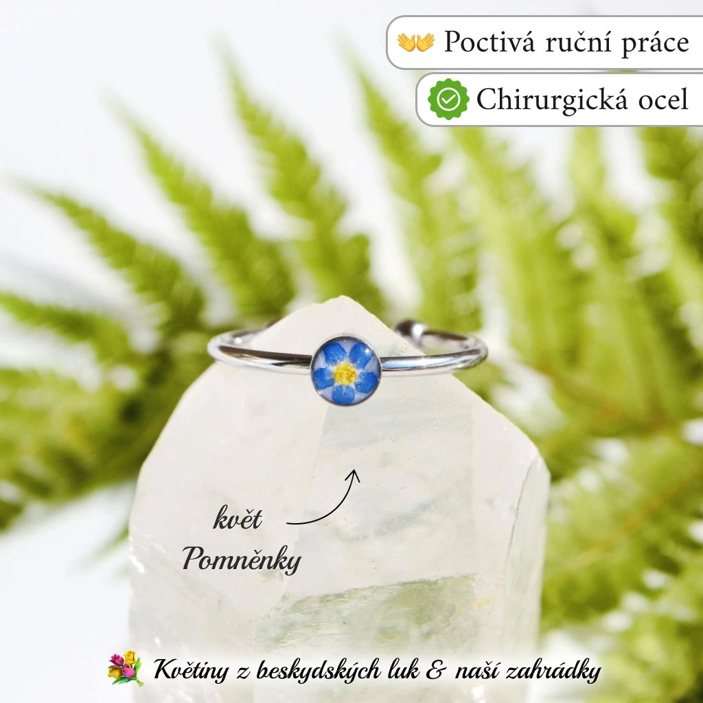 Něžný prstýnek, v kterém je ukryto kouzlo pomněnky jarní. Šperk Kvítek pomněnky je vyroben z opravdového, na beskydských loukách sbíraného, kvítku a z křišťálové pryskyřice. Kov je kvalitní chirurgická ocel. Každý šperk je naprosto jedinečným dílem.