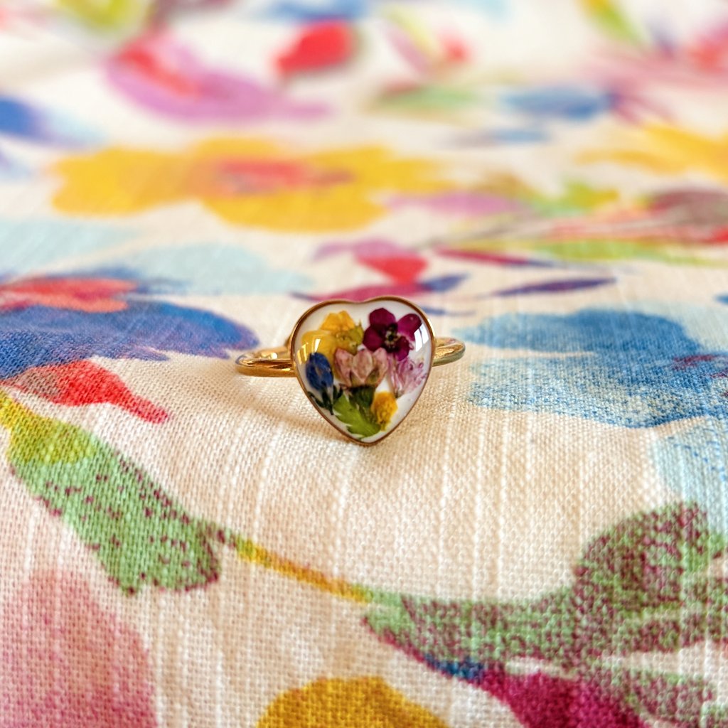 Prsten, v kterém je ukryto kouzlo beskydských luk. Šperk je vyroben z opravdového květu a z křišťálové pryskyřice. Kov je pozlacená chirurgická ocel. Každý šperk je naprosto jedinečným dílem.