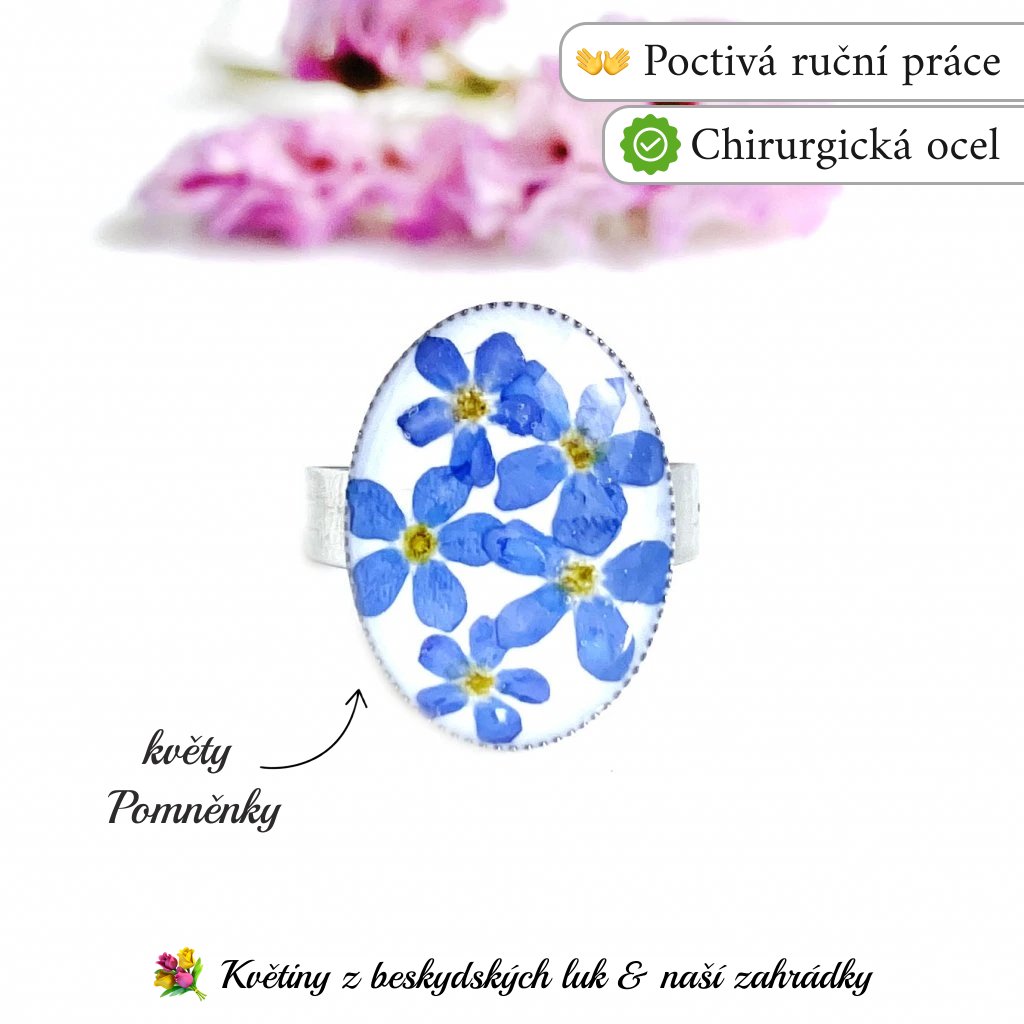 Prsten Pomněnky je vyroben z pravých beskydských kvítků pomněnky a z křišťálové pryskyřice. Kov je kvalitní chirurgická ocel. Každý šperk je naprosto jedinečným dílem.