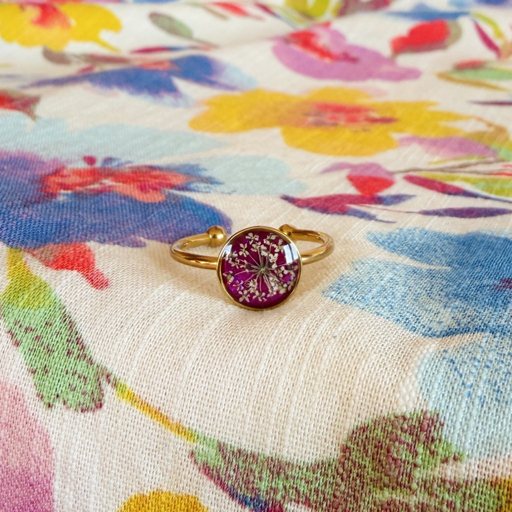Prsten, v kterém je ukryto kouzlo beskydských luk. Šperk je vyroben z opravdového květu a z křišťálové pryskyřice. Kov je pozlacená chirurgická ocel. Každý šperk je naprosto jedinečným dílem.