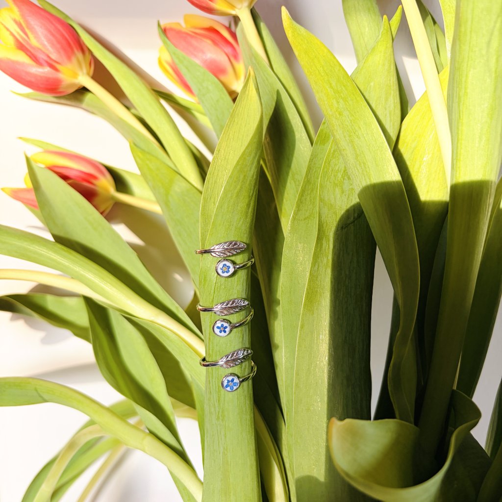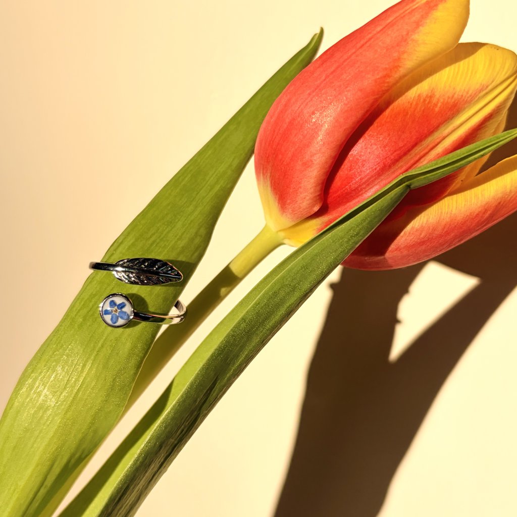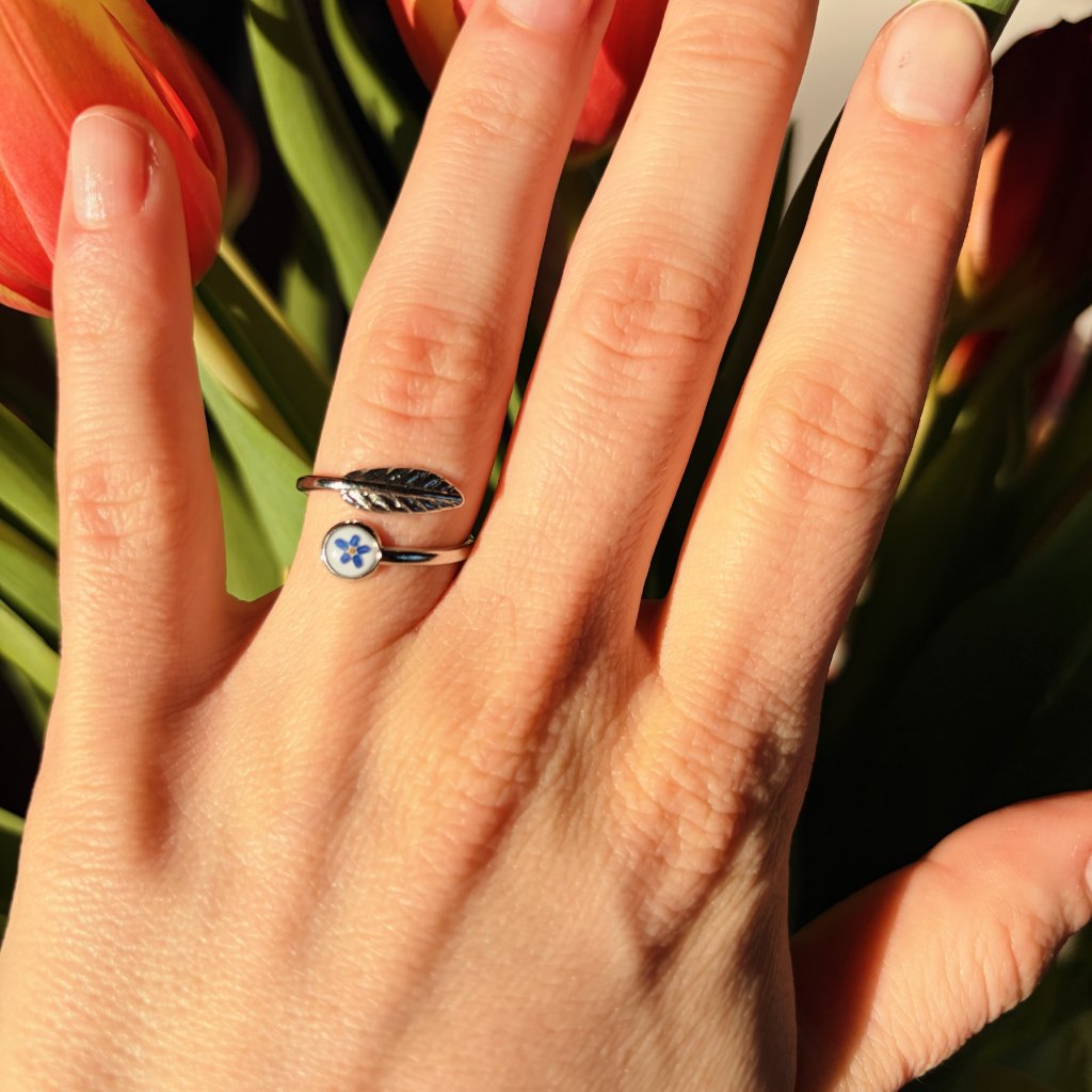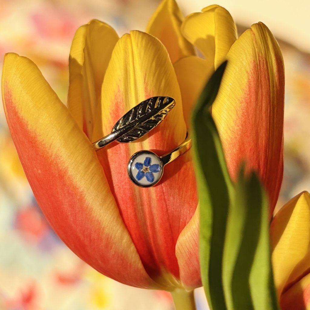 Prstýnek je vyroben z květu pomněnky, chirurgické oceli a křišťálové pryskyřice.