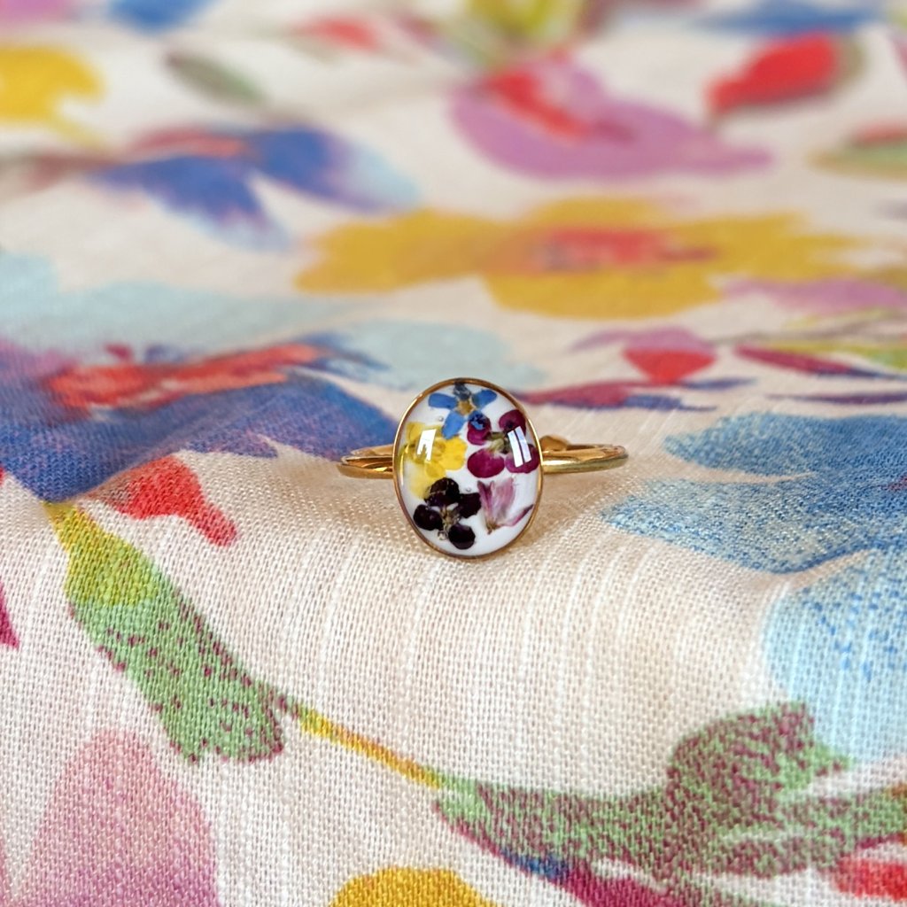 Prsten, v kterém je ukryto kouzlo beskydských luk. Šperk je vyroben z opravdového květu a z křišťálové pryskyřice. Kov je pozlacená chirurgická ocel. Každý šperk je naprosto jedinečným dílem.