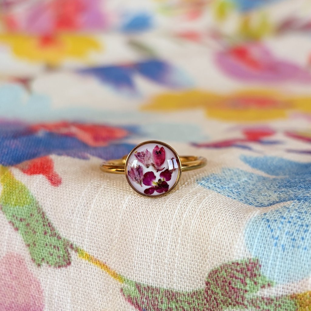 Prsten, v kterém je ukryto kouzlo beskydských luk. Šperk je vyroben z opravdového květu a z křišťálové pryskyřice. Kov je pozlacená chirurgická ocel. Každý šperk je naprosto jedinečným dílem.