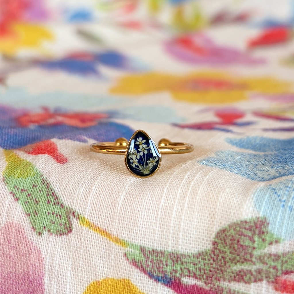 Prsten, v kterém je ukryto kouzlo beskydských luk. Šperk je vyroben z opravdového květu a z křišťálové pryskyřice. Kov je pozlacená chirurgická ocel. Každý šperk je naprosto jedinečným dílem.