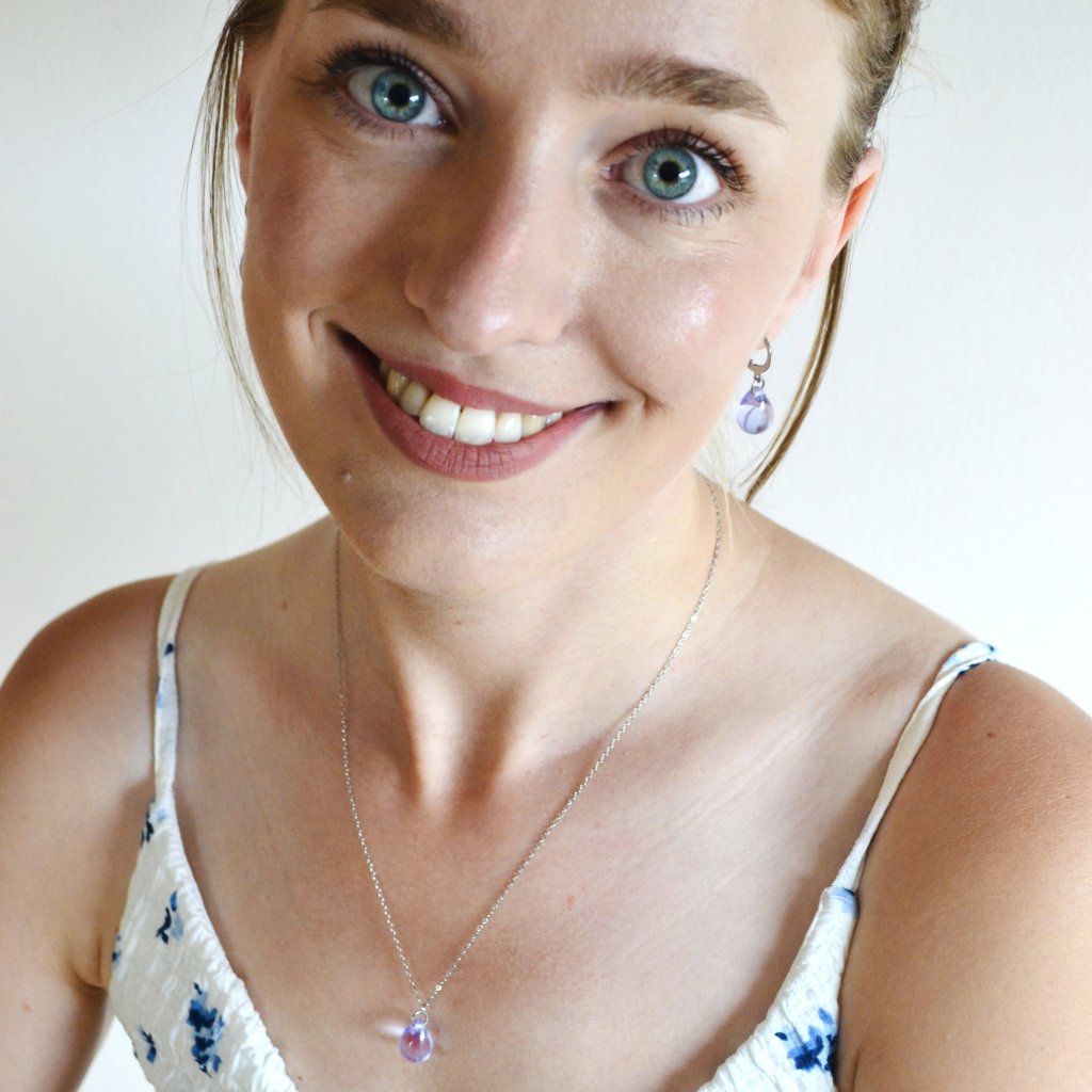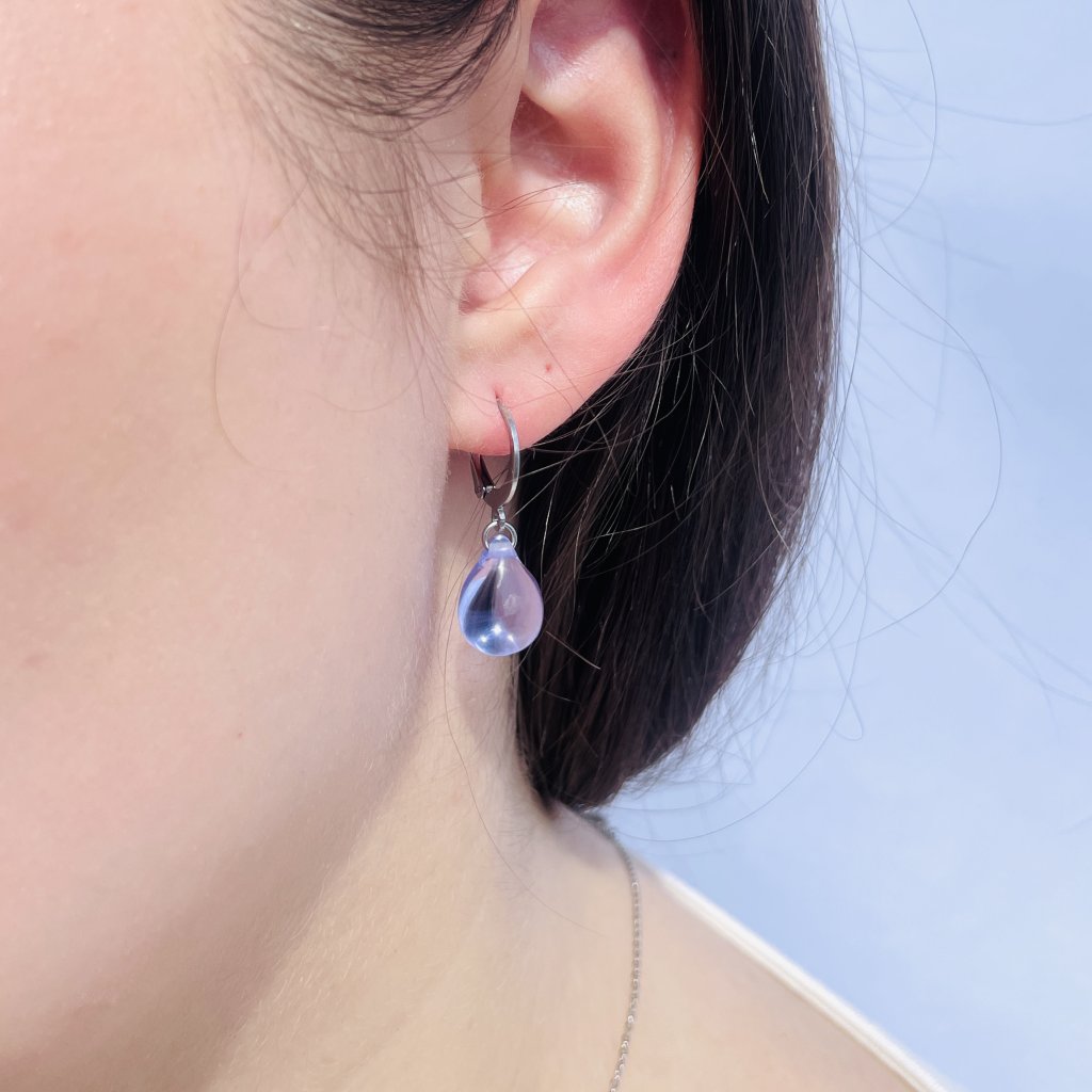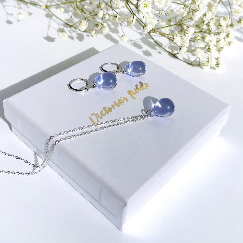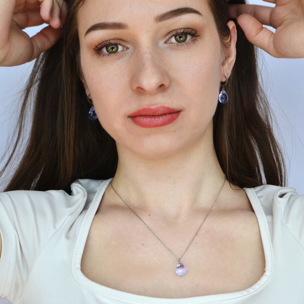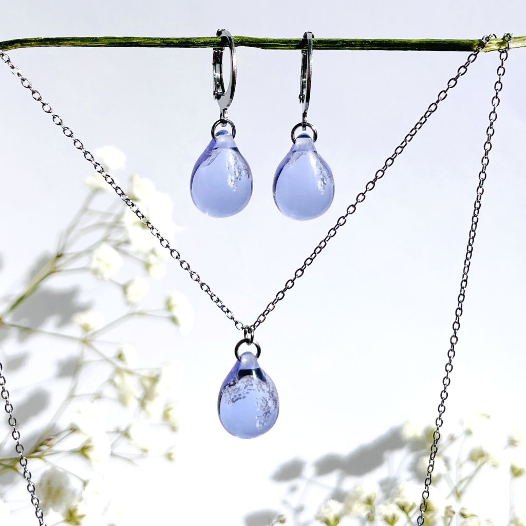 Nechte se okouzlit touto ručně vyrobenou sadou z českého skla a chirurgické oceli, která obsahuje náhrdelník a visací náušnice. Světle fialový odstín a tvar kapky vás přenesou do světa přírodní krásy a řemeslného umění. Každý kousek je jedinečný, vytvořený s láskou a péčí.
