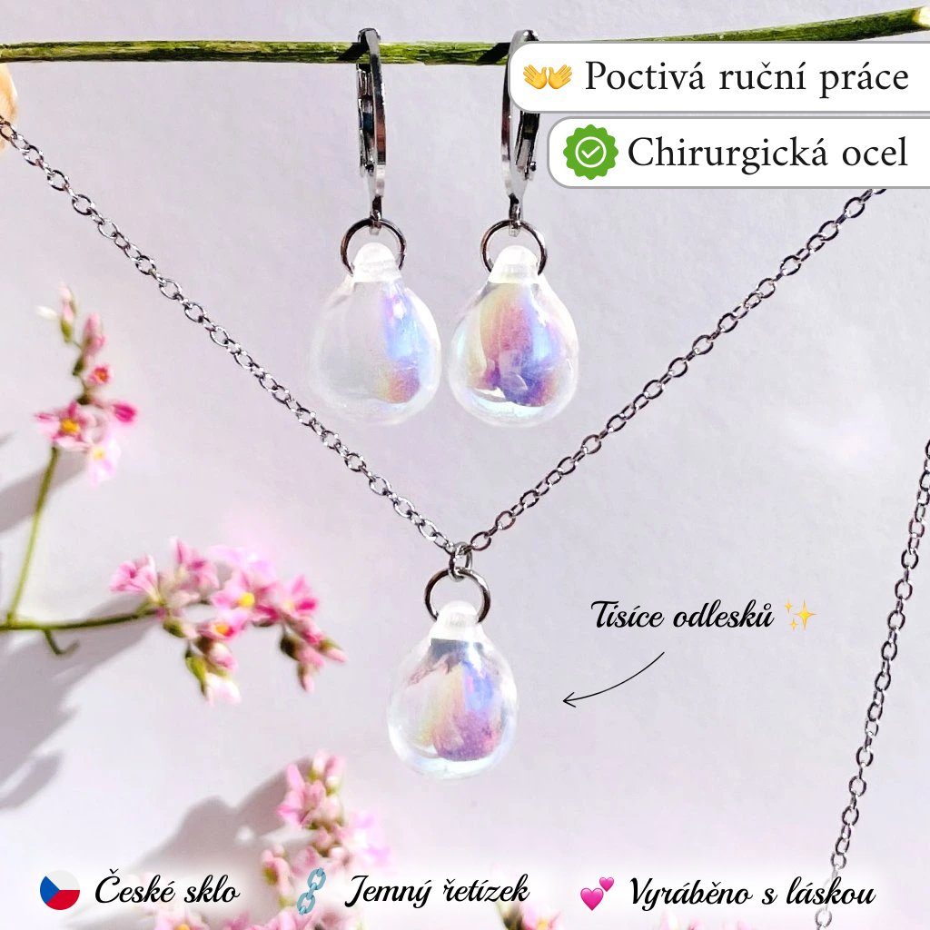 Jemné šperky sady Kapka rosy připomínají ten nejčistší okamžik přírody – chvíli, kdy se na listech třpytí ranní rosa a první paprsky světla se v ní lámou do tisíce barevných odlesků. Při pohybu zachycují odlesky, které připomínají okamžiky klidu a spojení s přírodou. Jsou to šperky, které nejsou jen ozdobou – jsou symbolem čistoty, jemnosti a vnitřního světla.
