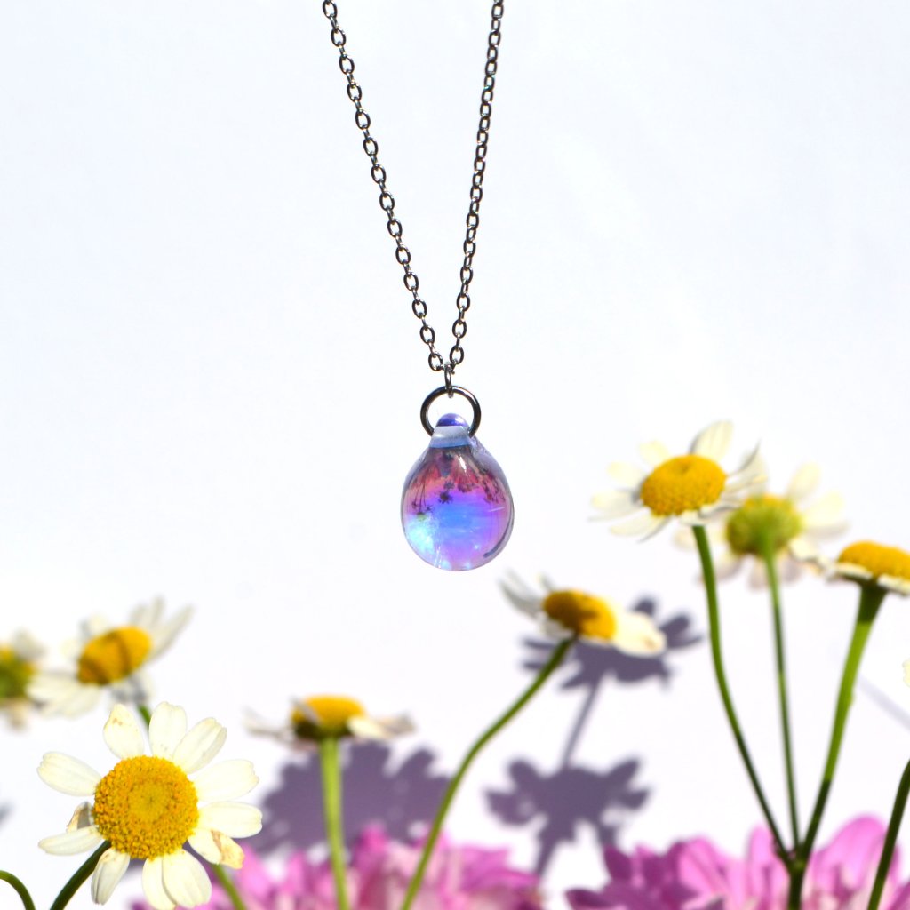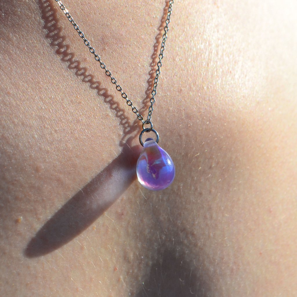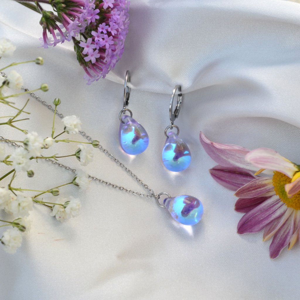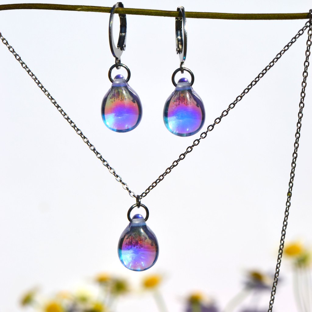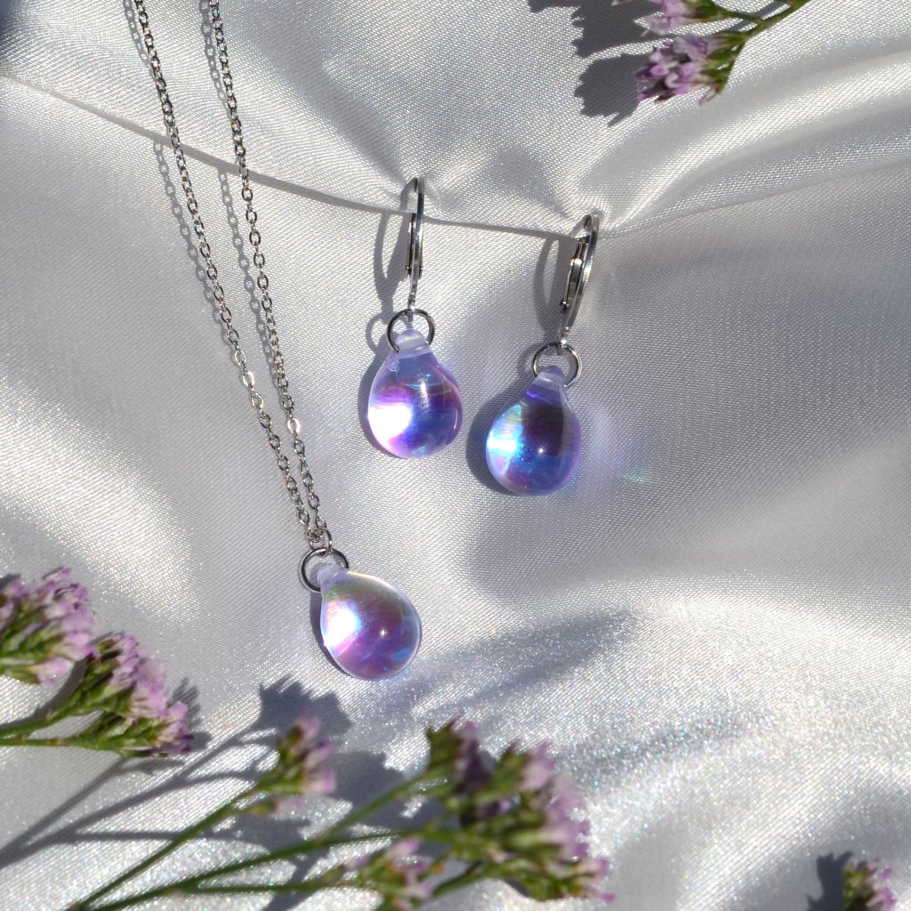 Jemně fialová sada Kapky štěstí je jako malý vesmír zachycený v jemném skle, nesoucí tajemství života a přírodní harmonie. Šperky přivolávají radost a štěstí do každodenního života. Okouzlí Vás duhovými odlesky, které zachytí a rozptýlí světlo jako jemný magický tanec. Budou Vašim amuletem, který Vám bude připomínat, že štěstí je všude kolem nás, přítomno i v těch nejjemnějších detailech, stačí jej jen vnímat a nechat proniknout do svého života.