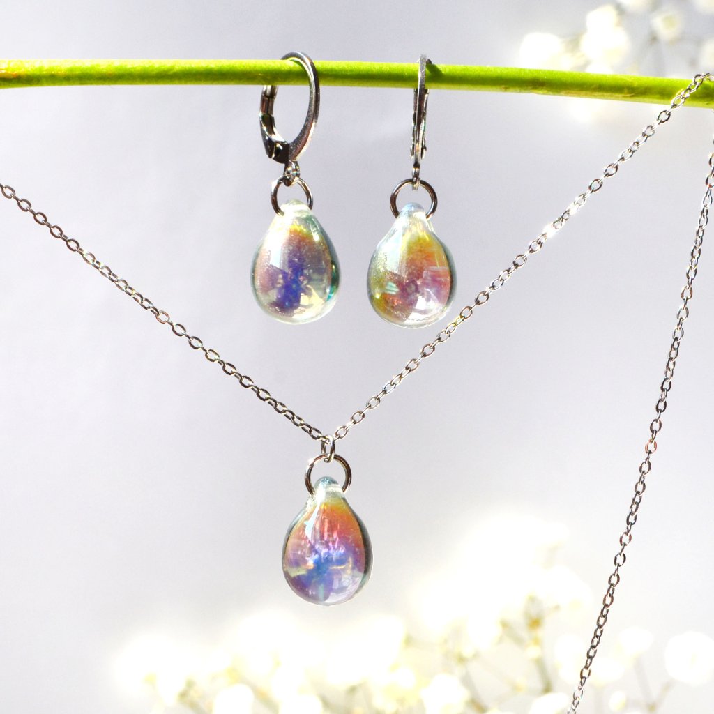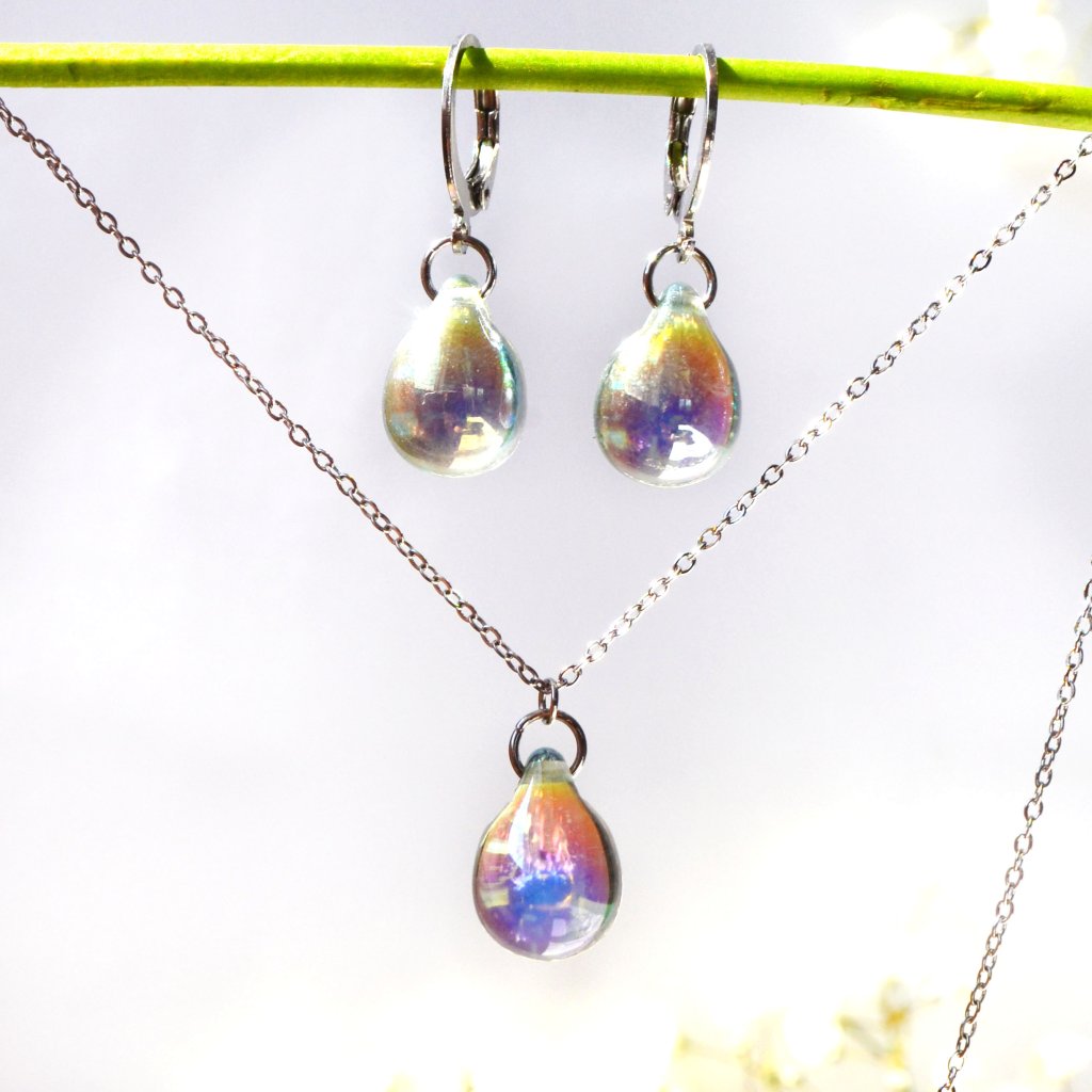 Sada obsahuje jeden náhrdelník a jeden pár visacích náušnic. Šperky jsou vyrobeny z českého skla a chirurgické oceli.