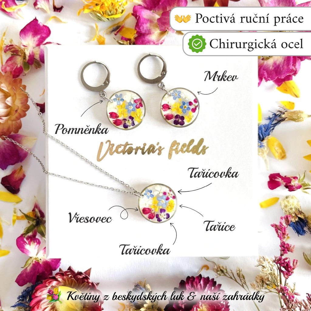 Sada Kouzlo okamžiku je vyrobena z kvítků tařice, tařicovky, mrkve, vřesovce, pomněnky a křišťálové pryskyřice. Kov je kvalitní chirurgická ocel. Každý šperk je naprosto jedinečným dílem. Set obsahuje náhrdelník a jeden pár visacích náušnic.