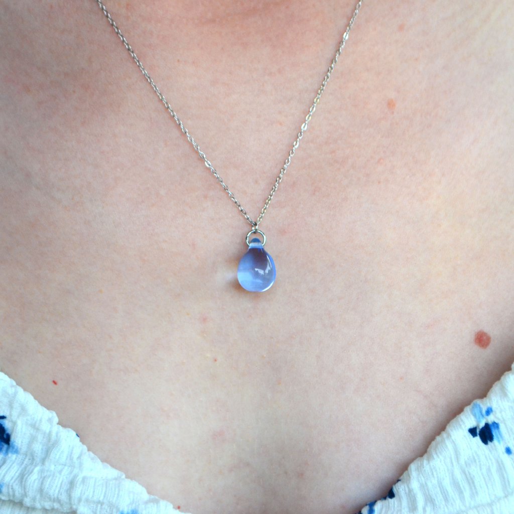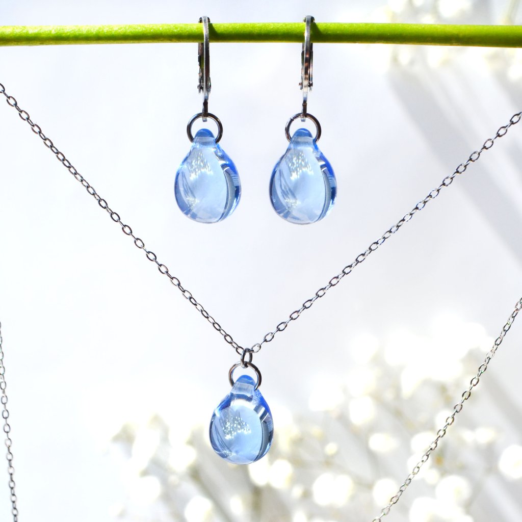 Jemně modrý odstín a tvar kapky vás přenesou do světa přírodní krásy a řemeslného umění. Každý kousek je jedinečný, vytvořený s láskou a péčí. Sada obsahuje jeden náhrdelník a jeden pár náušnic. Šperky jsou vyrobeny z českého skla a chirurgické oceli.
