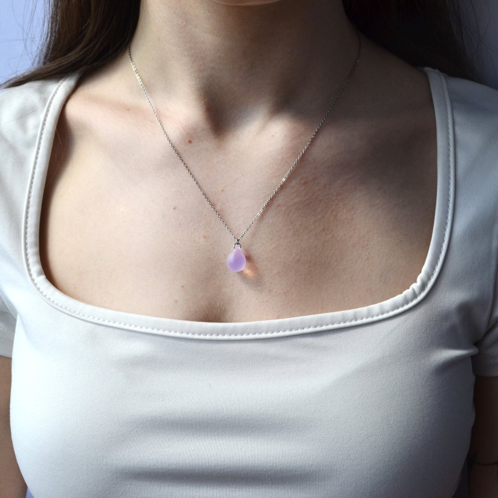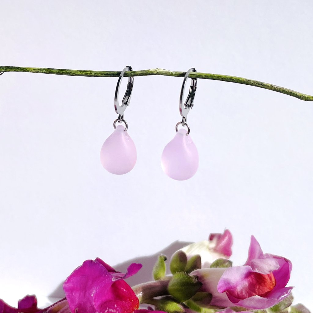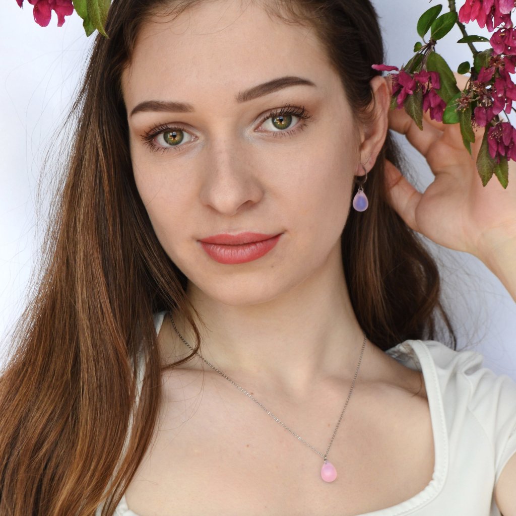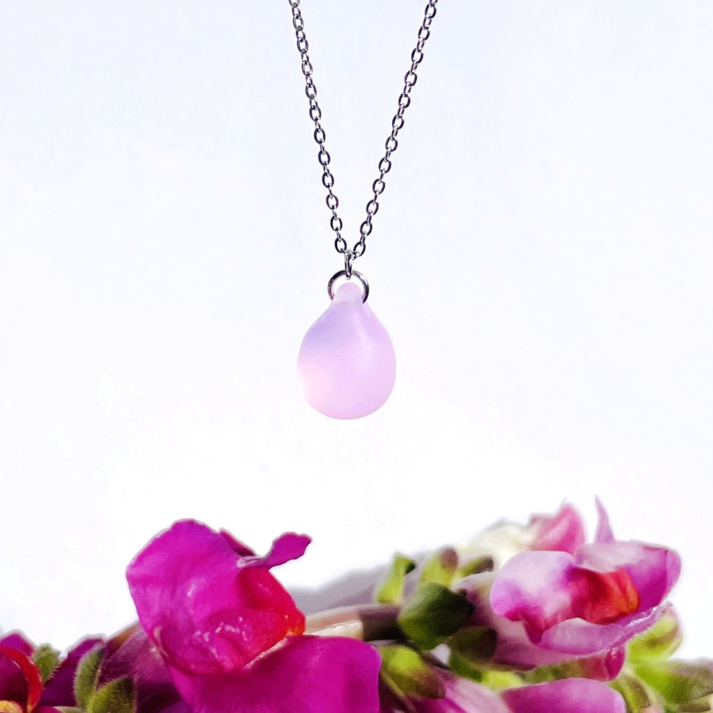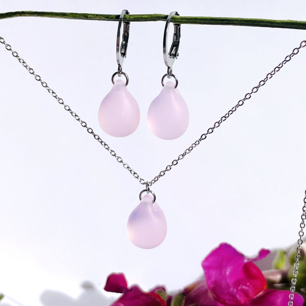 Nechte se okouzlit touto ručně vyrobenou sadou z českého skla a chirurgické oceli, která obsahuje náhrdelník a visací náušnice. Světle růžový odstín a tvar kapky vás přenesou do světa přírodní krásy a řemeslného umění. Každý kousek je jedinečný, vytvořený s láskou a péčí.