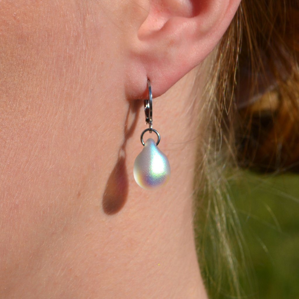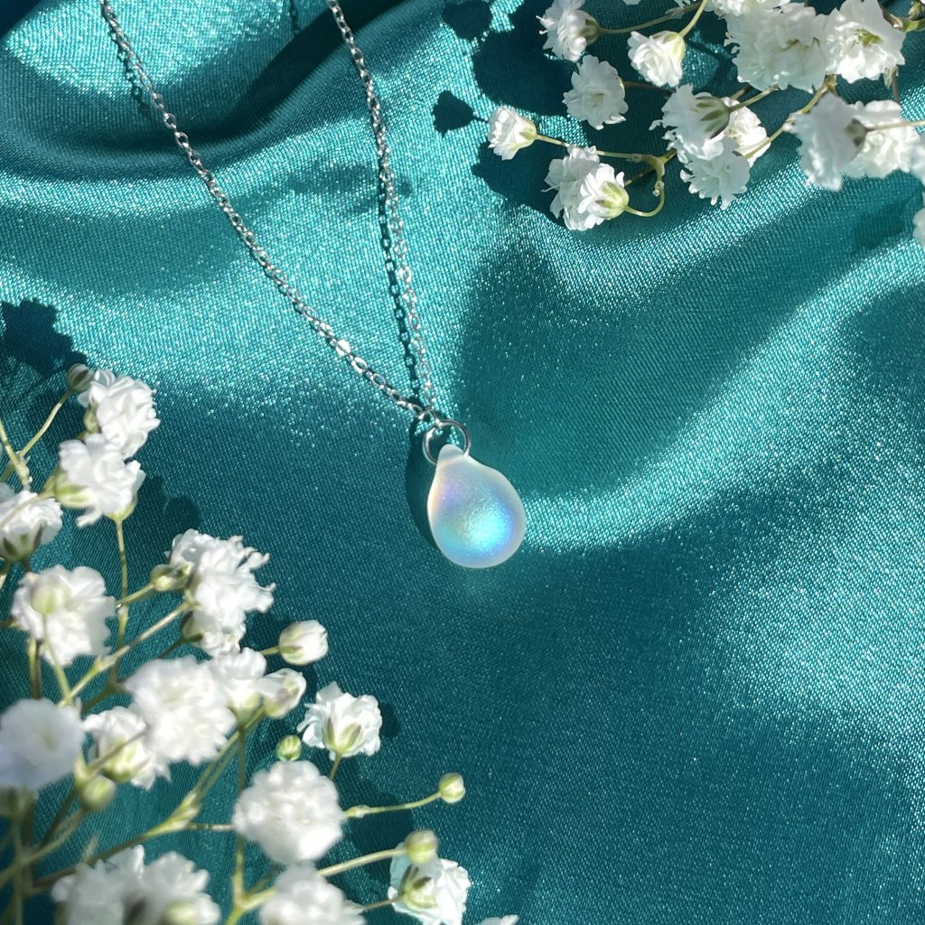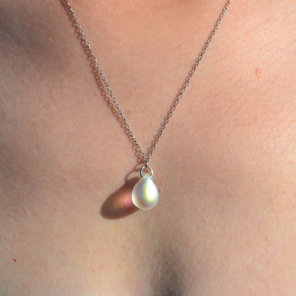 Kapka má bílý odstín a je matná s duhovými a perleťovými odlesky.