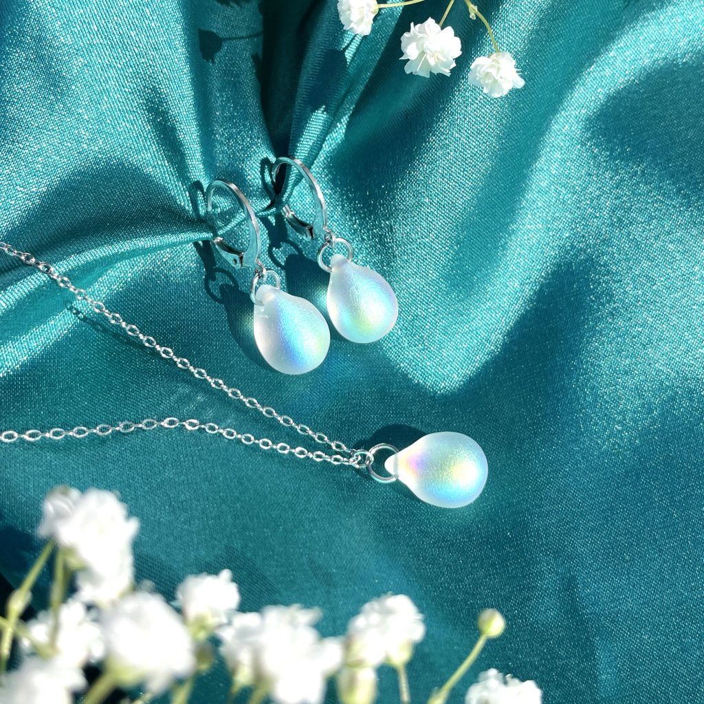 Sada obsahuje jeden pár náušnic a jeden náhrdelník. Šperky jsou vyrobeny z českého skla a chirurgické oceli.