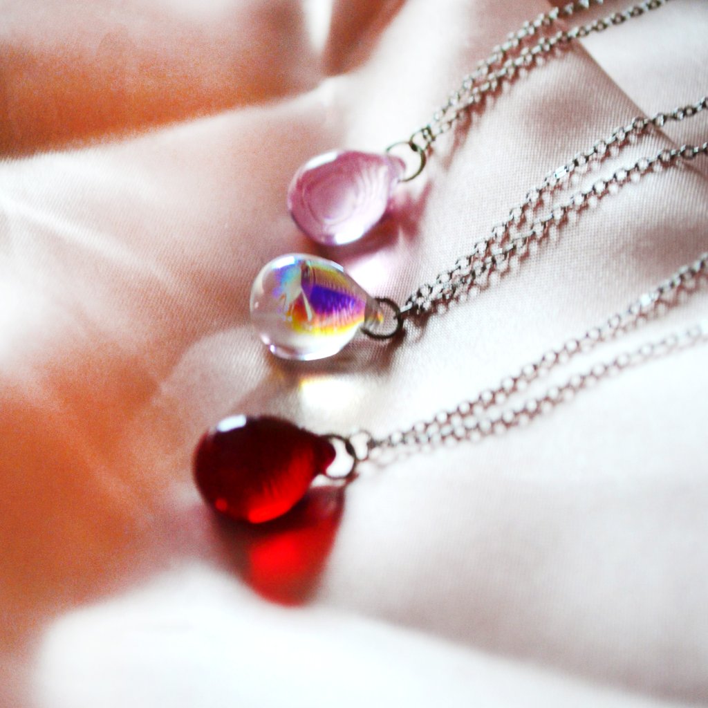 2. Barva lásky - V objetí tulipánů = světle růžová. Náhrdelník V objetí tulipánů připomíná ten nejlaskavější okamžik jara – chvíli, kdy se světle růžová kapka skla roztřepetává jako první tulipán v objetí teplého větru, lámajícího sluneční paprsky do pastelových snů. Při každém pohybu zachycuje odlesky, které evokují pocit hlubokého klidu, něžné euforie a spojení s přírodou. Je symbolem harmonie, svobody a naděje.